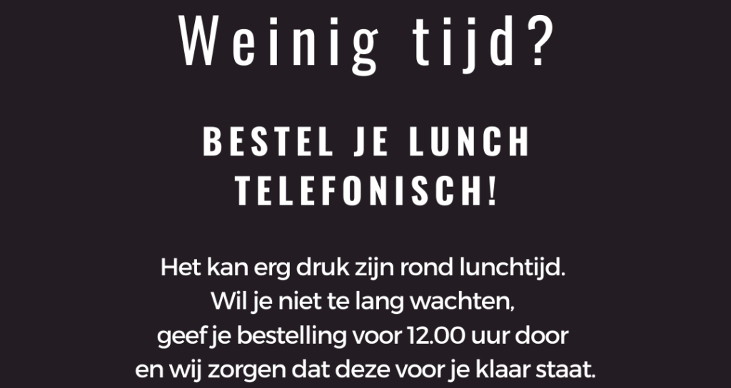 Lekker lunchen op het werk, een vergadering met het hele bedrijf of misschien wel voor een feestje thuis? Wij bezorgen ook. Kijk eens naar de mogelijkheden van onze bezorgservice. Liever een lunch op maat? Neem contact met ons op en wij zorgen ervoor.